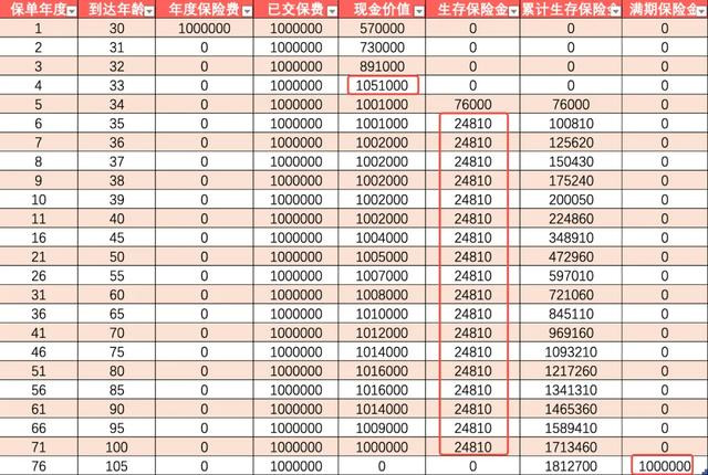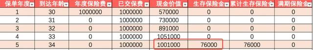 从第6年开始每年还有24810元,相当每年可以给到2.48%的利益,同时产品的现金价值从第4年开始就大于已交保费,如果想要已交保费,都可以通过退保的方式来拿到。最后到了保险期满百岁以后领取100万的已交保费用于传承。